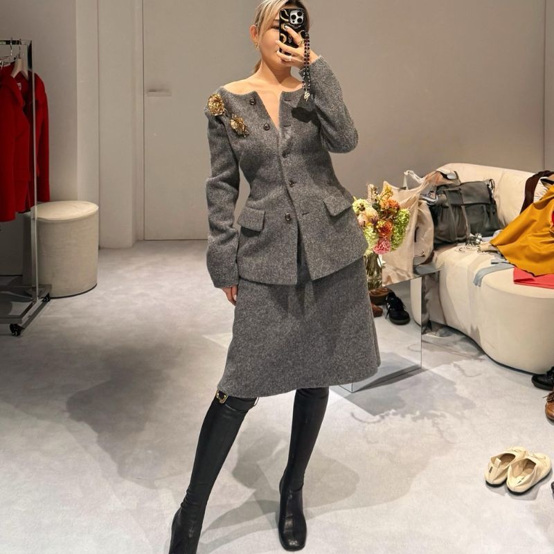 black suede knee-high boots.