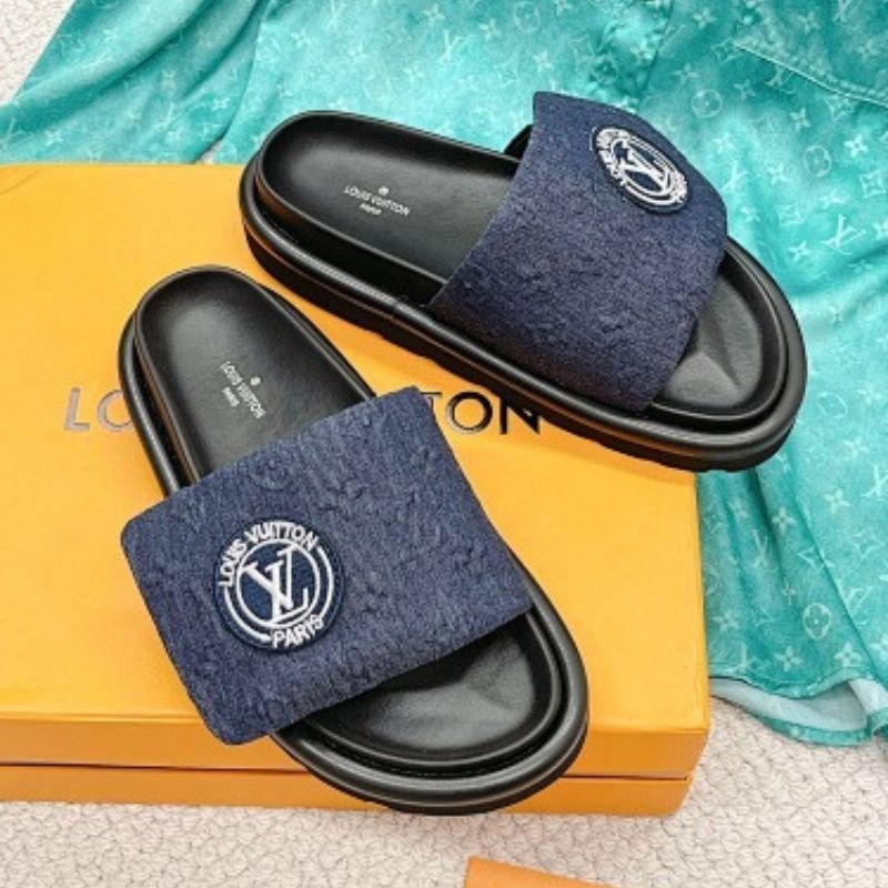 Louis Vuitton Pool Pillow Flat Comfort Mules in blue Monogram denim.