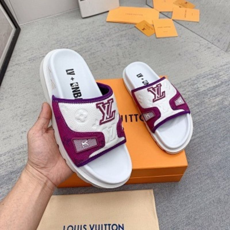 Louis Vuitton Pool Pillow Flat Comfort Mules in white with purple/magenta trim