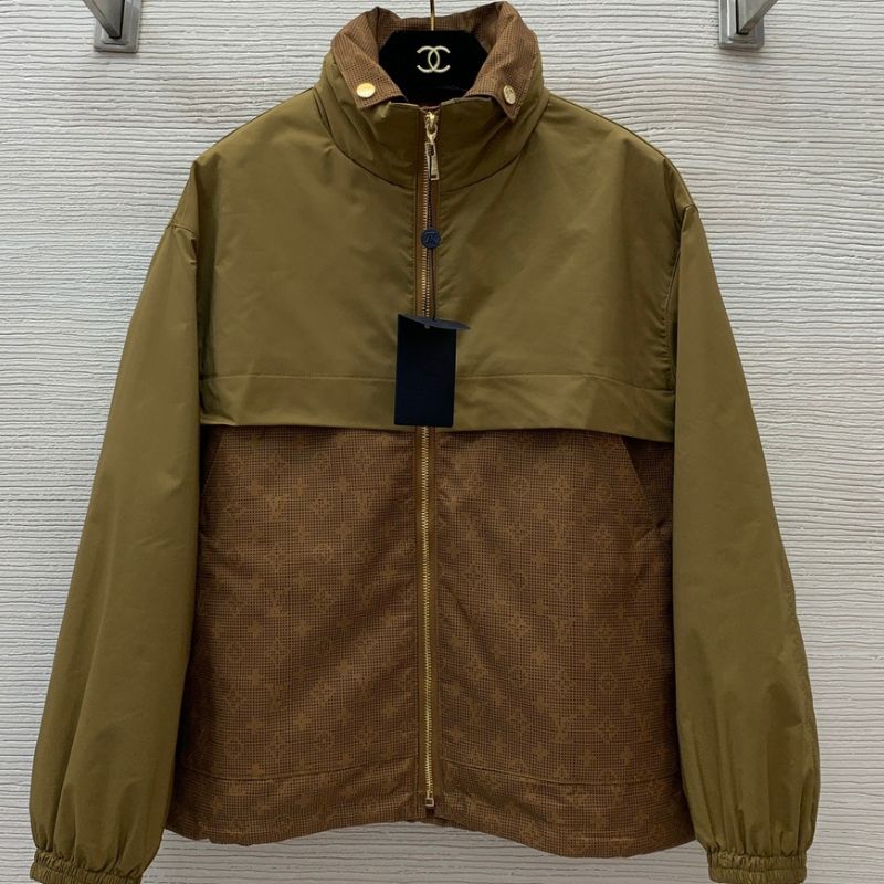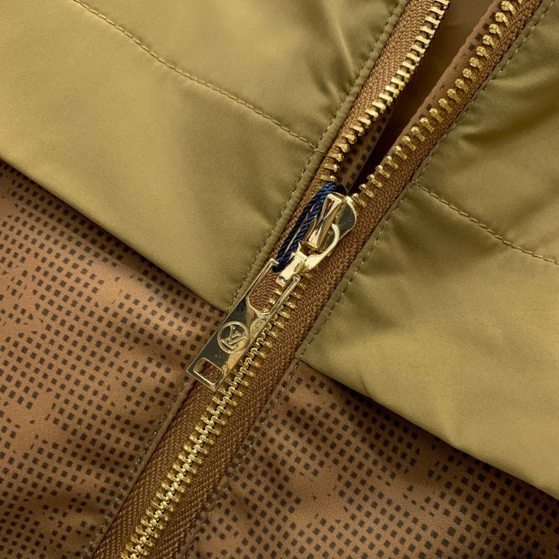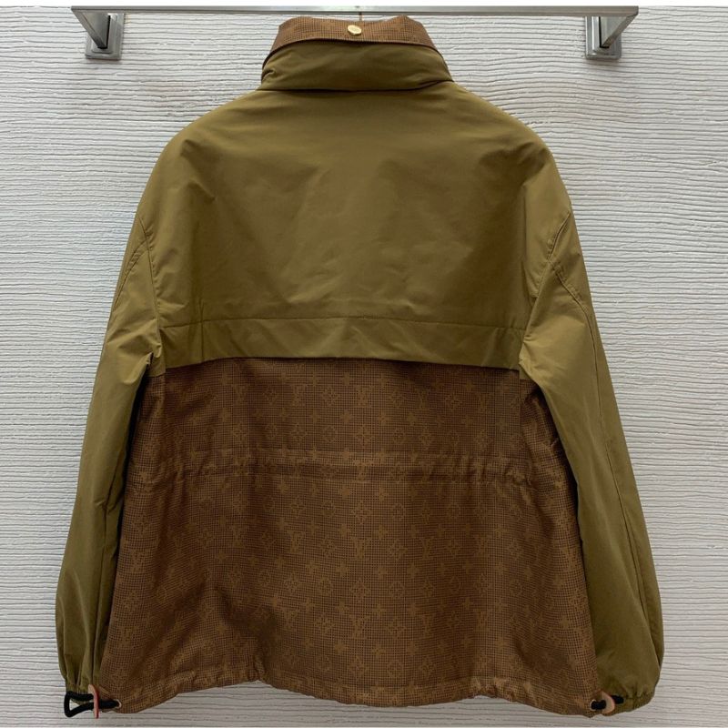 Louis LV's latest fashion-forward jacket features a classic monogram print with logo letter hardware accessories for a touch of luxury. The waist drawstring ensures a flattering fit, while the zipper closure and hidden storage hood add versatility and functionality.