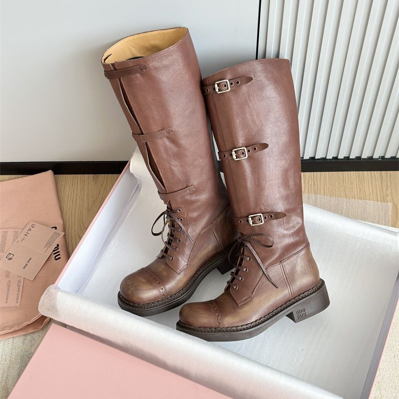 Miu Miu Tall Leather Boots with Straps and Buckles.