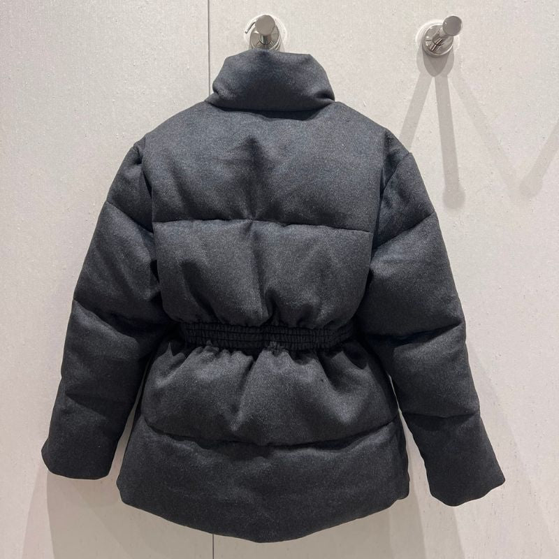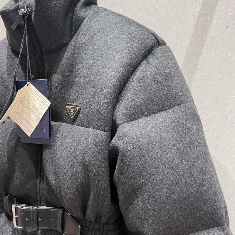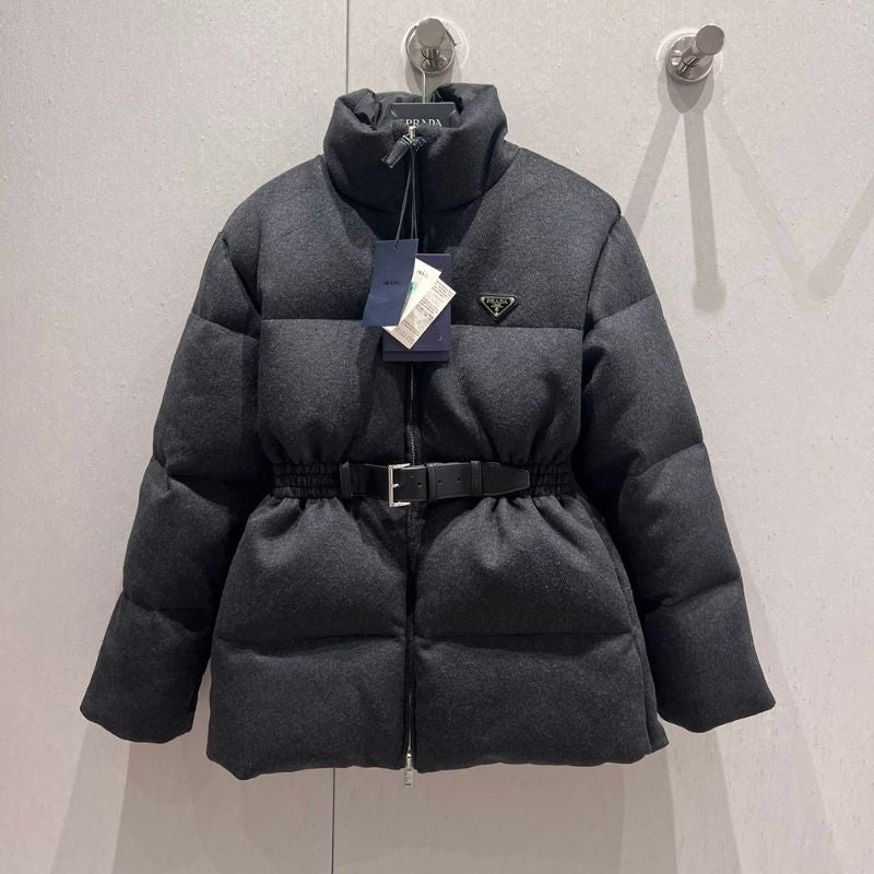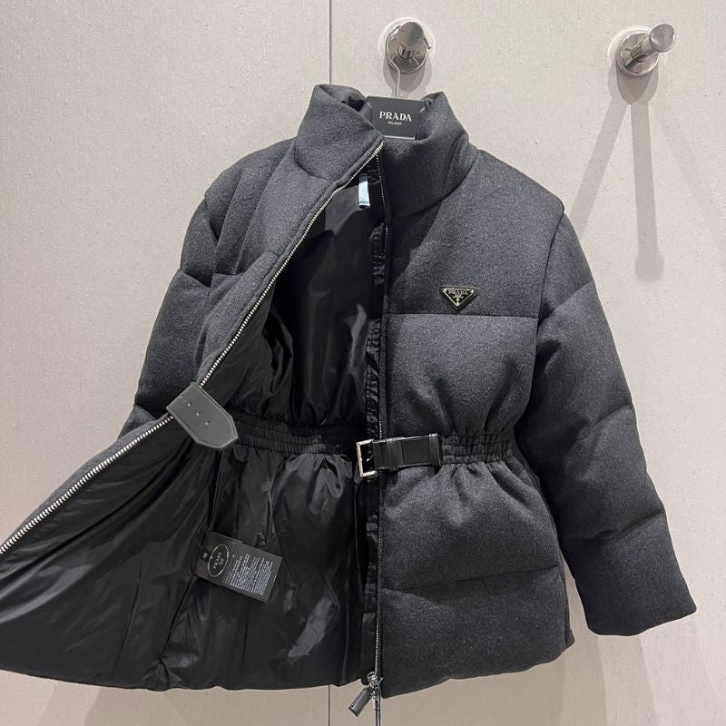 Introducing the Prada Belted Woolen Down Jacket an exclusive high-fashion design perfect for autumn and winter. Featuring a stand-up collar and a buckle waist for a tailored, stylish fit, this jacket blends three-dimensional craftsmanship with urban streetwear charm.